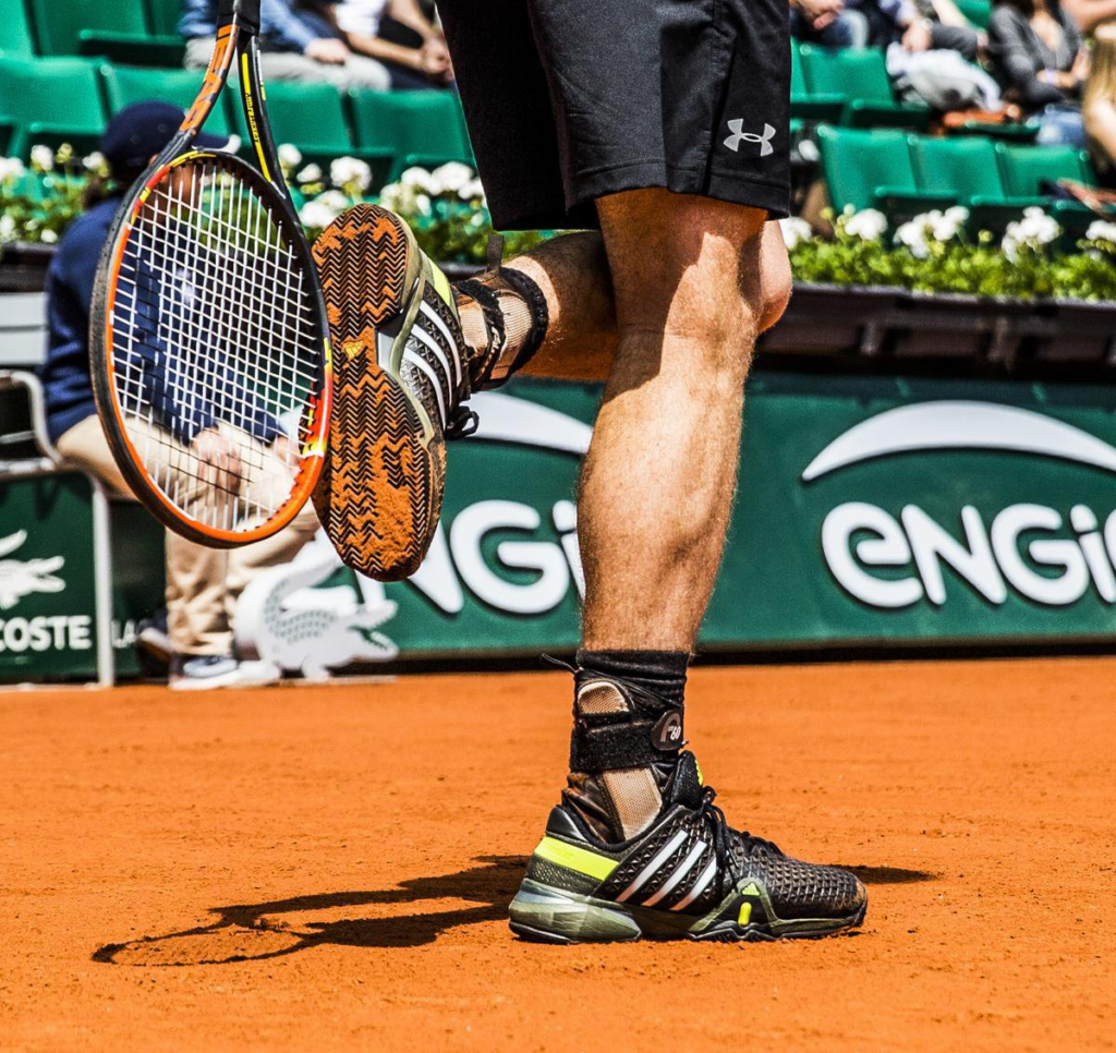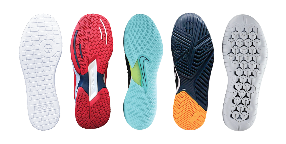 Повний малюнок ялинки вгризається у дрібну крихту і водночас викидає її з канавок щоб підошва не забивалась і зберігала зчеплення. На пальцях і внутрішньому краї часто є посилення для драгів. Верх роблять щільнішим щоб пил не прошивав сіткy. Такі пари зазвичай гнучкіші у передній частині щоб легше стартувати з місця та повертатися в центр корту.